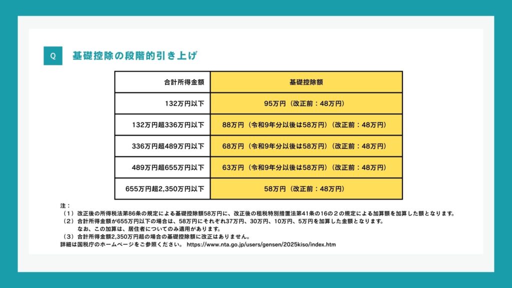 また、この段階的な基礎控除は2025年と2026年の2年間限定の特例で、令和7・8年分(2025・2026年分)の加算措置は暫定です。令和9年分(2027年分)以後は原則58万円に整理されます。