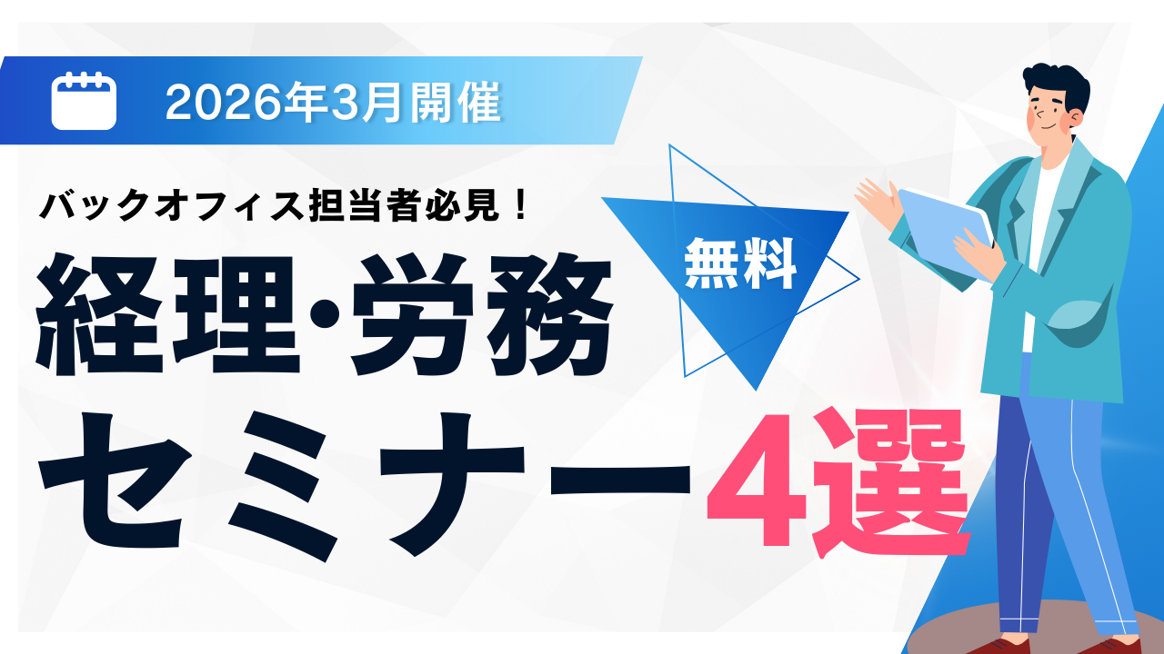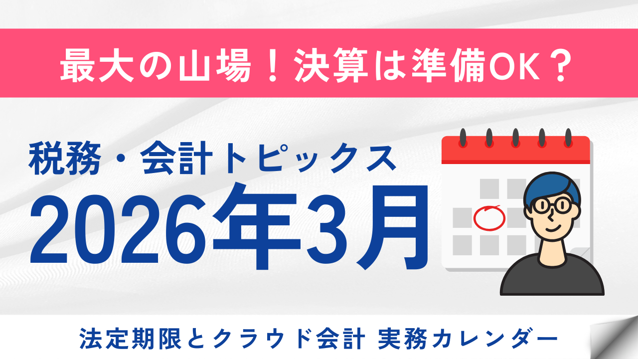 【2026年3月】税務・会計トピックス ~法定期限とクラウド会計 実務カレンダー~ 2026.02.26 管理者 クラウド会計無料相談センター 【お得】マネーフォワード クラウド会計 法人限定で最大1年間 実質0円キャンペーン実施中!概要と活用のポイント 2026.02.26 管理者 クラウド会計無料相談センター 【2026年3月開催】経理・労務のおすすめ無料セミナー4選!業務改善・バックオフィス見直しに役立つ★ 2026.02.18 管理者 クラウド会計無料相談センター 【2026年2月開催】経理・労務のおすすめ無料セミナー4選!仕訳入力超効率化から税制改正・AI活用まで 2026.02.06 管理者 クラウド会計無料相談センター 【完全ガイド】税理士が教える「税務調査」対策|勘定科目別 〜仕入編〜 2026.02.03 管理者 クラウド会計無料相談センター 【完全ガイド】税理士が教える「税務調査」対策|勘定科目別 〜売上編〜 2026.02.03 管理者 クラウド会計無料相談センター 【速報】「デジタル化・AI導入補助金」のチラシが公開!制度概要とIT導入補助金との違いを解説 2026.01.19 管理者 クラウド会計無料相談センター 仕入先が多い会社ほど、支払い業務は "限界" に近づく 中小企業の“支払業務”を助ける請求・支払DXツール 「invox受取請求書」 とは? 2026.01.16 管理者 クラウド会計無料相談センター 全プランで 「明細一覧の取引後残高」 が確認可能に!残高ズレの特定がスムーズになります【MFクラウド機能改善】 2026.01.16 管理者 クラウド会計無料相談センター 一人経理 「3つのパターン」 と現実的な解決策 | 第1回 一人経理でも揺るがない経理体制のつくり方 2026.01.16 管理者 クラウド会計無料相談センター …1234…7